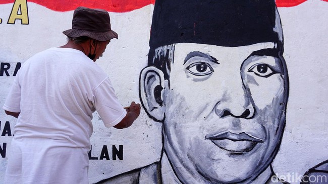 Magelang - Peringatan Hari Lahir Pancasila jatuh pada Rabu (1/6) besok. Warga Muntilan, Magelang, Jawa Tengah menyambutnya dengan membuat mural bertema Pancasila.
