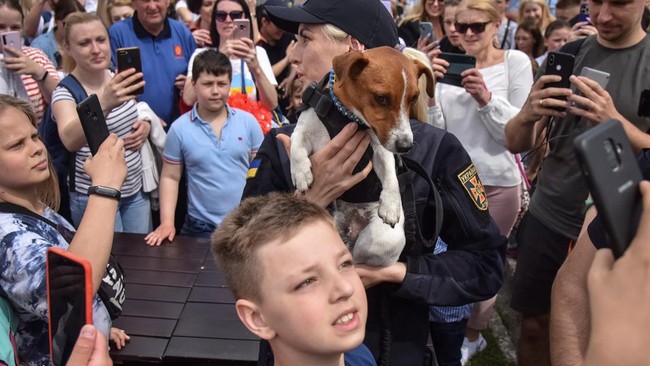 Lviv - Seekor anjing pelacak ranjau, Patron, dikerubuti warga untuk diajak foto bersama. Tersohor usai mendapat medali kerhormatan dari presiden Ukraina. Cekrek!