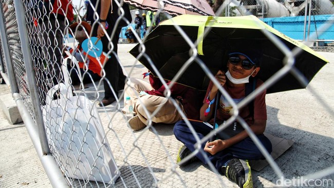Jakarta - Ajang Formula E sedang berlangsung di Jakarta International E-Prix Circuit, Sabtu (4/6). Meski cuaca panas, warga tetap antusias menonton sambil membawa payung.
