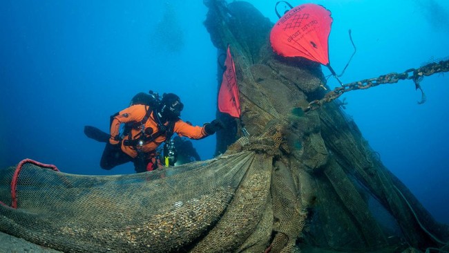 Yunani - Penyelam dari kelompok lingkungan Ghost Diving mengangkut jaring yang dijuluki jaring 'hantu' di lepas pulau Ithaca, Yunani. Seperti apa penampakannya?