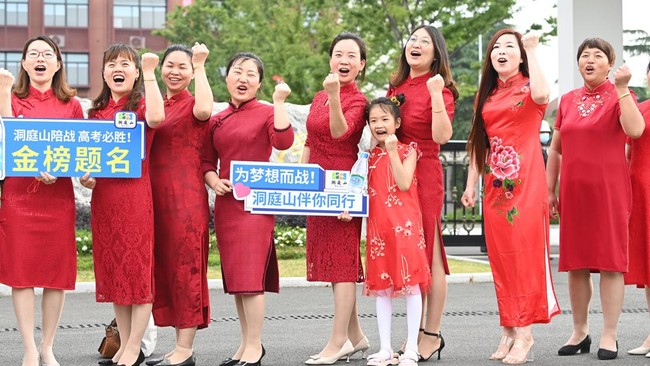 Para orang tua mengenakan cheongsam saat bersorak untuk anak-anak mereka yang bersiap untuk mengikuti Ujian Masuk Perguruan Tinggi Nasional 2022 atau disebut Gaokao, di Kunshan, Provinsi Jiangsu, China, Selasa (7/6/2022). (Wang Xuzhong/VCG/Getty Images).