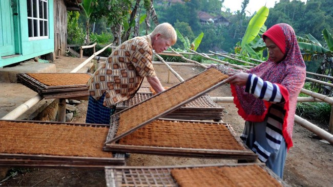 Salah seorang warga albinisme ditemani istrinya saat menjemur tembakau di Desa Ciburuy, Kabupaten Garut, Jawa Barat, Jumat, (9/6/2022).
