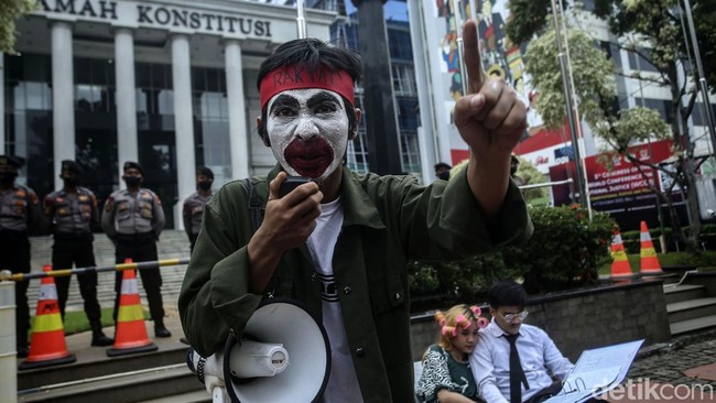 Jakarta - Kelompok Teater Sejahtera menggelar aksi teatrikal di depan Gedung MK, Jakarta. Aksi teatrikal tersebut menyikapi situasi MK dari kacamata seniman.