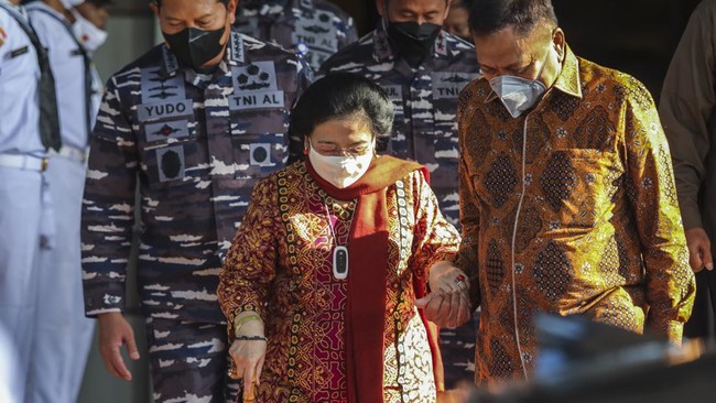 Presiden RI kelima Megawati Soekarnoputri (tengah) didampingi Kepala Staf TNI AL Laksamana TNI Yudo Margona (kiri) meninggalkan ruangan usai pembicara dalam kegiatan Sarasehan Pembinaan Mental Ideologi di Jakarta, Selasa (20/6/2022).