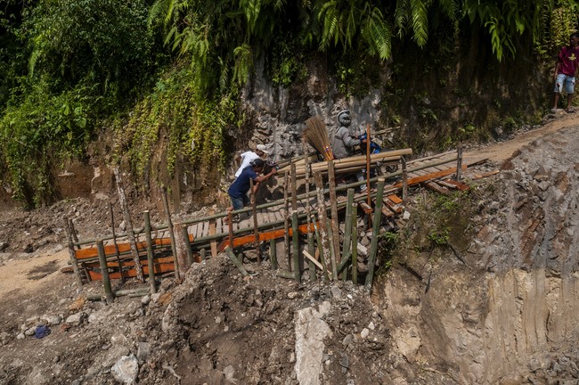 Lebak - Warga membangun jalan darurat dari papan kayu sekitar 10 meter di Cikulur, Lebak, Banten, Senin (20/6/2022). Solusi mepet akibat jalan amblas.