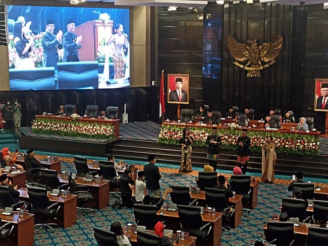Jakarta - DPRD DKI Jakarta menggelar rapat paripurna HUT Jakarta ke-495. Ada momen Anies Baswedan dan Ketua DPRD DKI manortor saat rapat.