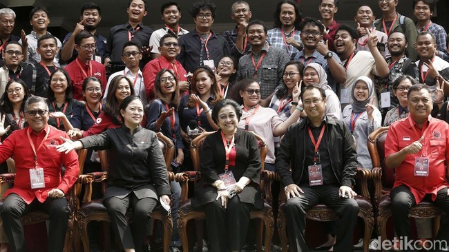Jakarta - Ketum PDIP Megawati Soekarnoputri berfoto bersama sejumlah wartawan di hari ketiga Rakernas II PDIP. Ketua DPP PDIP Puan Maharani tampak ikut foto bersama.
