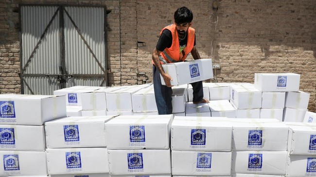 Seorang sukarelawan dari Yayasan Al-Khidmat menata kotak-kotak makanan di di Peshawar, Pakistan, Kamis, (23/6/2022) untuk dikirimkan kepada para korban gempa di Afghanistan.