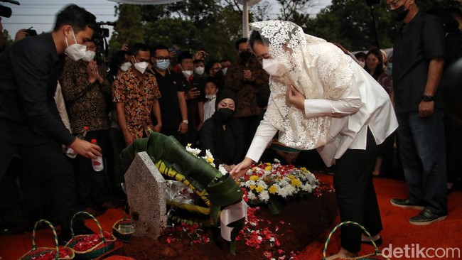 Jakarta - Ketua DPR RI Puan Maharani melakukan tabur bunga di makam Tjahjo Kumolo. Tabur bunga ini juga diikuti oleh pihak keluarga.