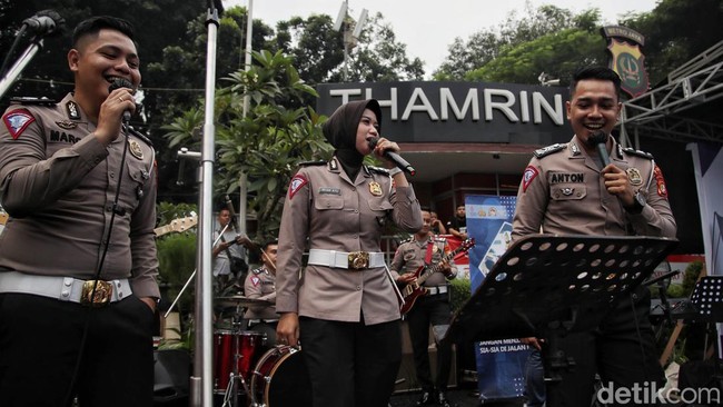 Jakarta - Cakra Metro Band yang digawangi anggota Polri ikut memeriahkan HUT Bhayangkara di CFD Bundaran HI, Jakarta. Warga nampak antusias ikut berjoget dan bernyanyi.