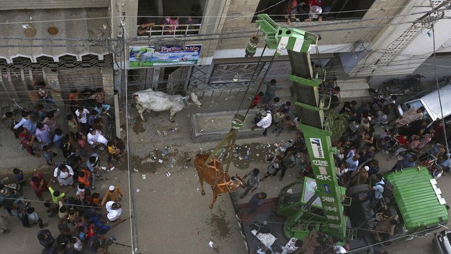 Pakistan - Sapi-sapi bergelantungan dengan alat berat di Pakistan. Rupanya, kandang yang berada di atap gedung membuat sapi itu harus diturunkan dengan alat berat.