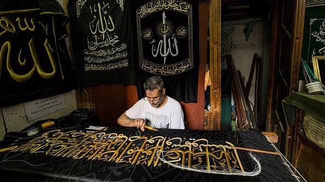 Penyulam Mesir, Ahmed Othman el-Kassabgy, menjahit rangkaian ayat-ayat Al Qur'an dengan benang emas, di Kairo, Mesir, Rabu (15/6/2022). Keluarga tersebut dipercaya untuk membuat kiswah secara turun menurun sejak abad ke-13.