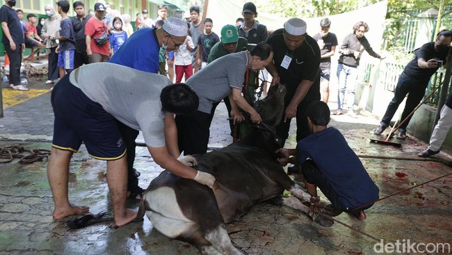 Jakarta - Sejumlah umat muslim Muhammadiyah di kawasan Tebet, Jakarta, melaksanakan pemotongan hewan kurban hari ini, Sabtu (9/7/2022).