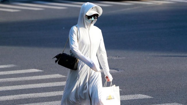 Seorang warga terlihat menutupi badan dengan pakaian khusus saat Shanghai diterpa gelombang panas ekstrem, Minggu (10/7/2022).