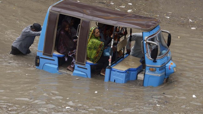 Pakistan - Banjir merendam jalan-jalan di kota Karachi, Senin (11/7). Kendaraan mogok dan harus didorong. Pusat keuangan Pakistan itu nyaris lumpuh.