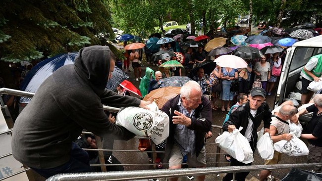 Ukraina - Sejumlah warga di Ukraina harus antre hingga hujan-hujanan demi mendapat bantuan makanan. Bantuan makanan tersebut dikelola berbagai LSM.
