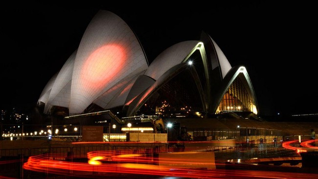 Gedung Opera Australia yang terkenal di Sydney menyala dengan warna nuansa bendera Jepang, Minggu, (10/7/2022), untuk menghormati mantan Perdana Menteri Jepang Shinzo Abe yang terbunuh. (Muhammad Farooq/AFP/Getty Images)
