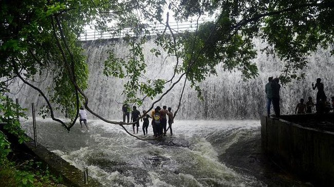 India - Bendungan Powai mengalami kelebihan debit air akibat hujan deras. Aliran air yang tumpah dimanfaatkan warga untuk berenang dan main air tanpa rasa takut.
