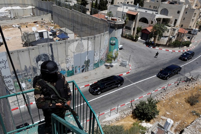 Petugas keamanan berjaga di jalur yang dilewati kendaraan Presiden Joe Biden, di Tepi Barat, Palestina, Jumat (15/7/2022).