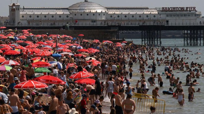 Inggris - Badan meteorologi dan cuaca Inggris mengeluarkan peringatan panas yang luar biasa. Di tengah ancaman cuaca panas itu, ribuan warga Inggris menyerbu pantai.