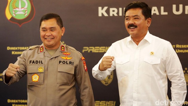 Kapolda Metro Jaya, Inspektur Jenderal (Irjen) Fadil Imran (kiri) didampingi Menteri Agraria dan Tata Ruang/Badan Pertanahan Nasional (ATR/BPN) Hadi Tjahjanto saat merilis pengungkapan kasus mafia tanah di Mapolda Metro Jaya, Jl Sudirman, Jakarta, Senin (18/7/2022).