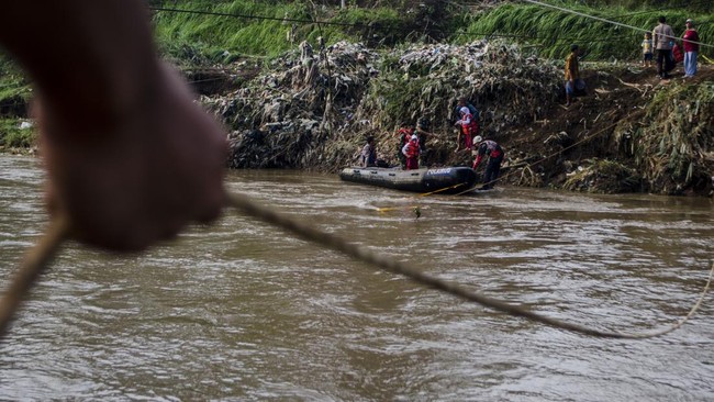 Tim SAR gabungan membantu pelajar menaiki perahu karet untuk menyebrangi Sungai Cimanuk, Garut, Jawa Barat, Selasa (19/7/2022).