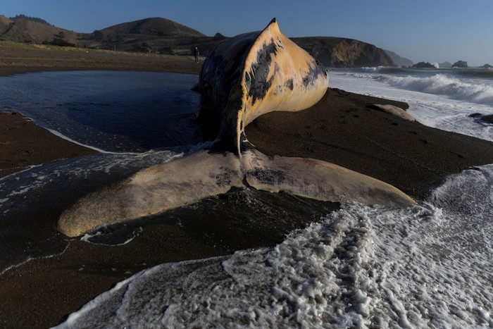 Warga melintas di bagian ekor paus bungkukΒ yang mati di Pantai Sharp Park, California.Β Paus bungkuk merupakan salah satu spesies paus balin, tidak punya gigi. Balin ini semacam lempengan berserat di dalam mulut paus yang terbuat dari keratin. Balin ini yang digunakan untuk 'mengunyah' makanan seperti plankton, ikan, dan udang.