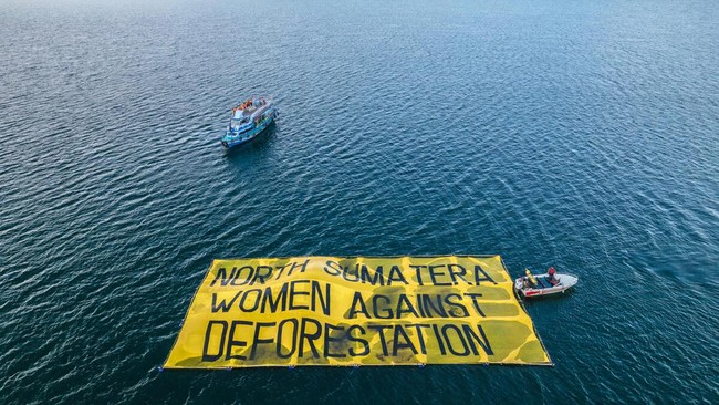 Sumut - Sebuah spanduk raksasa bertuliskan 'Perempuan Sumatera Utara Menolak Deforestasi' mengapung di kawasan Danau Toba.