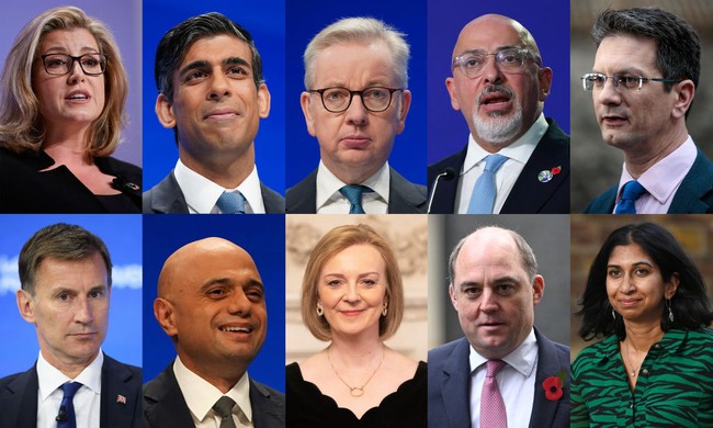 Kombinasi foto kandidat PM Inggris pengganti Boris Johnson, (dari kiri searah jarum jam) Penny Mordaunt, Rishi Sunak, Michael Gove, Nadhim Zahawi, Steve Baker, Suella Braverman, Ben Wallace, Liz Truss, Sajid Javid and Jeremy Hunt. Partai akan menyeleksi calon pengganti PM Boris Johnson. Perdana Menteri Inggris yang baru akan diumumkan pada 5 September mendatang. (Getty Images)