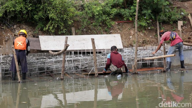 Jakarta - Pembangunan turap Kali Ciliwung tengah dikerjakan di kawasan Pasar Baru, Jakarta. Pembangunan turap ini untuk mencegah banjir dan tanah ambles.