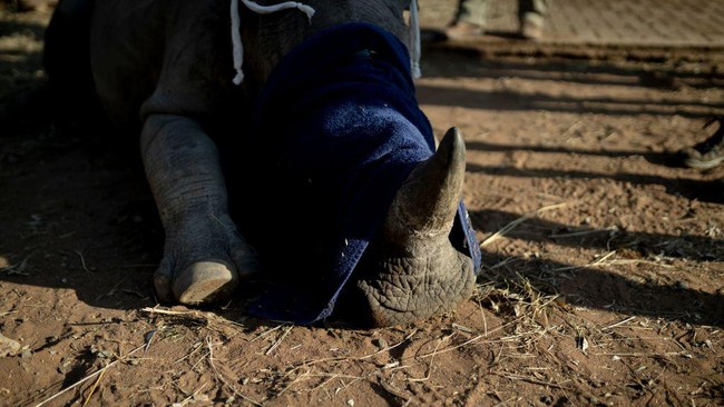 Seekor anak badak putih ditutup matanya setelah disuntik dengan obat penenang di sebuah lokasi yang dirahasiakan di sebuah provinsi Limpopo, Afrika Selatan, Kamis, (14/7/2022). Lokasi ini disebut The Rhino Orphanage.