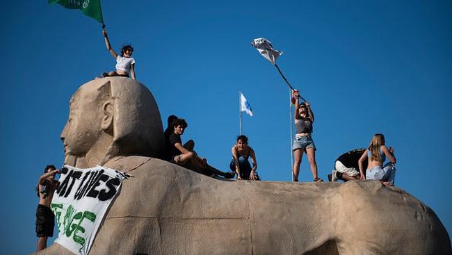 Italia - Para aktivis iklim di Italia bersatu dalam aksi bersama melawan ancaman perubahan iklim. Aksi ini menarik perhatian karena dilakukan di atas patung sphinx.