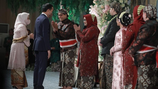 Jakarta - Presiden Jokowi bersama Ibu Negara Iriana hadir di acara pernikana putri dari Anies Baswedan. Jokowi dan Iriana memberikan ucapan selamat di acara tersebut.