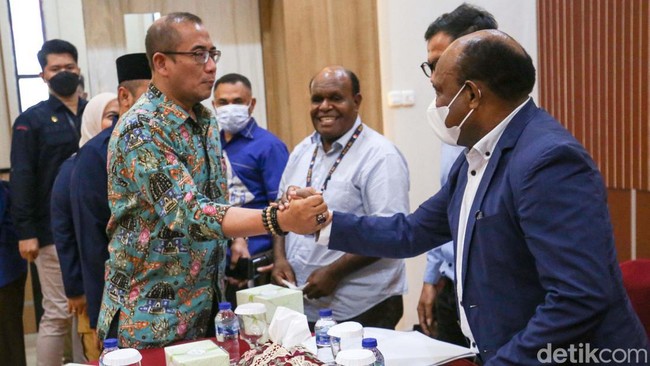 Ketua Majelis Rakyat Papua (MRP) Timotius Murip (kanan) berjabat tangan dengan Ketua KPU, Hasyim Asy'ari, di Kantor KPU, Jakarta, Selasa (2/8/2022).