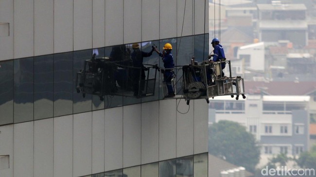 Jakarta - Pekerja pembersih kaca terlihat di kawasan Kuningan, Jakarta, Rabu (3/8). Pekerjaan ini termasuk beresiko tinggi. Butuh disiplin keselamatan supaya tetap aman.