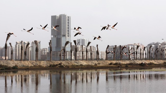 Flamingo merah muda terbang melewati perkebunan pohon palem baru, di Hutan Kota Clifton, yang sebelumnya merupakan tempat pembuangan sampah di Karachi, Pakistan, Rabu, (22/6/2022). Clifton merupakan salah satu distrik di Karachi yang erat dengan cuaca panas dan sampah. Namun kini terlihat sebuah sudut yang hijau.