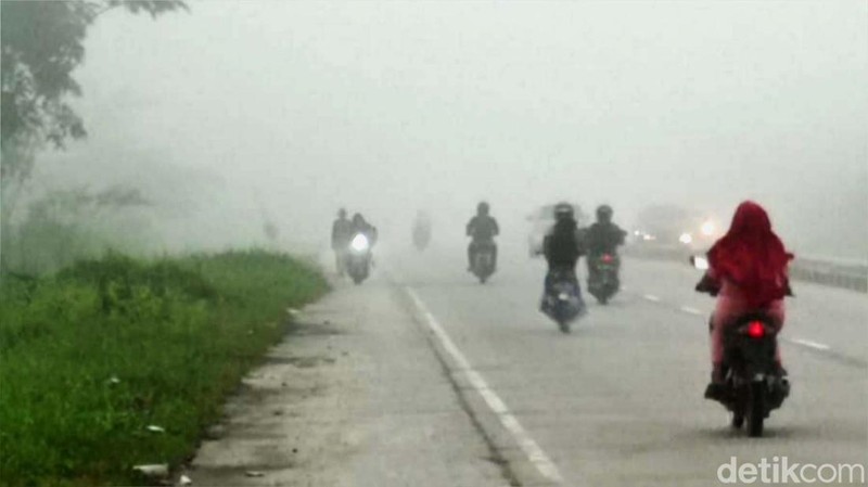 Jarak pandang di beberapa lokasi bahkan sangat terbatas atau hanya 300-350 meter.