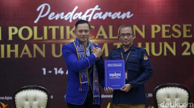 Jakarta - Agus Harimurti Yudhoyono (AHY) memimpin rombongan Partai Demokrat mendatangi kantor KPU RI. Mereka mendaftar sebagai peserta pemilu 2024.
