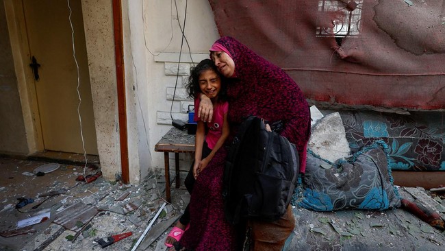 Gaza - Serangan udara Israel ke wilayah Gaza, Palestina, merusak rumah-rumah warga sipil Palestina. Isak tangis pecah dari sang pemilik rumah.