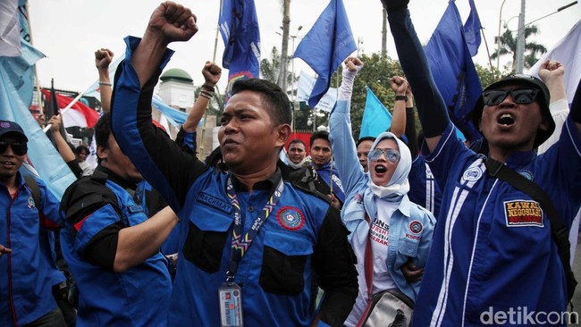 Jakarta - Buruh berdemo di depan Gedung DPR/MPR Jakarta. Mereka menuntut kesejahteraan dan menolak Omnibus Law. Sempat memblokade jalan. Ini foto-fotonya.