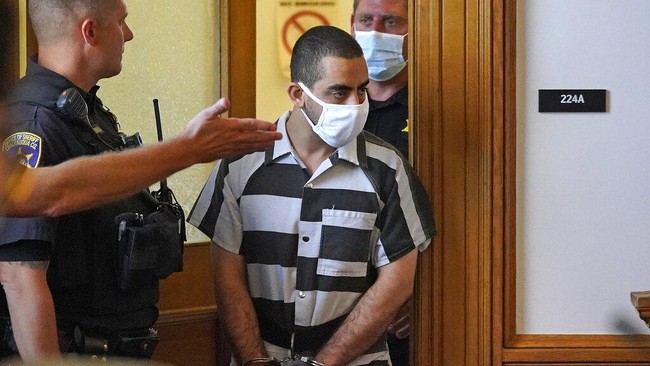 Hadi Matar (24) tiba untuk mendengar sidang dakwaan di Pengadilan Chautauqua County, Mayville, New York, Sabtu, (13/8/2022). Matar yang dituduh melakukan serangan penusukan terhadap penulis 'Satanic Verses; Salman Rushdie telah memasuki pengadilan pembelaan tidak bersalah di pengadilan New York atas tuduhan percobaan pembunuhan dan penyerangan.