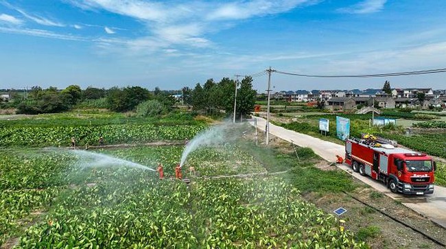 China - Petugas pemadam kebakaran di China ikut bantu menyirami kebun warga. Cuaca panas yang tinggi membuat perkebunan warga kekurangan pasokan air.