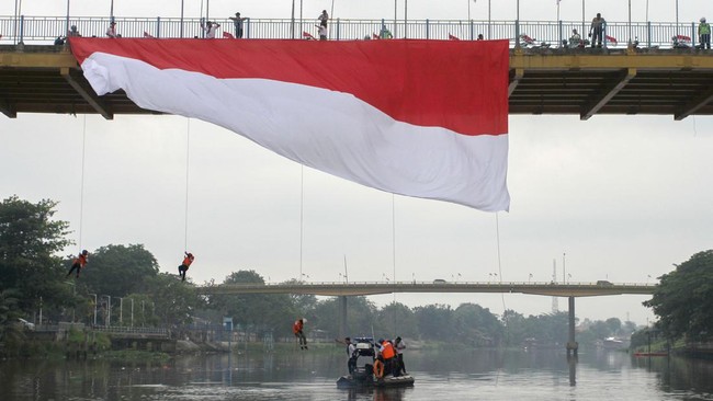 Jakarta - Sejumlah daerah menggelar pengibaran bendera merah putih untuk memperingati HUT Ke-77 RI. Pengibaran dilakukan dari Jembatan Pekanbaru hingga Tebing Padalarang.