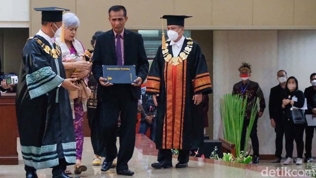 Tangerang - Samuel Hutabarat menangis saat mewakili wisuda anaknya, Brigadir Yosua Nofriansyah Hutabarat di Universitas Terbuka (UT) Tangsel. Begini momennya.