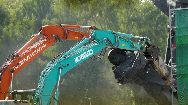 Detik-detik Patung Soviet Setinggi 80 Meter di Latvia Dirobohkan