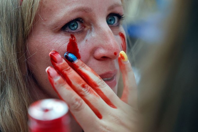 Perempuan melukis wajahnya menggunakan pewarna merah darah saat beraksi untuk memperingati Hari Kemerdekaan Ukraina, di Berlin, Jerman, Kamis (24/8/2022). Ukraina merayakan hari kemerdekaan setiap tanggal 24 Agustus. (Odd Andersen/AFP via Getty Images)