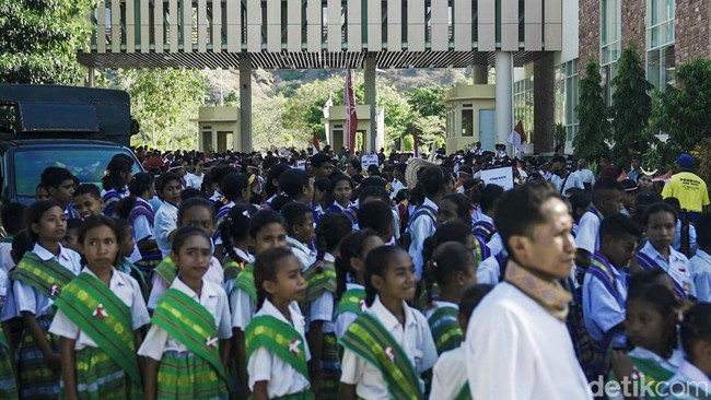 NTT - Semangat nasionalisme turut dimaknai masyarakat Insana Utara yang berbatasan dengan Timor Leste. Mereka menggelar karnaval budaya dengan jalan kaki sejauh 5 km.