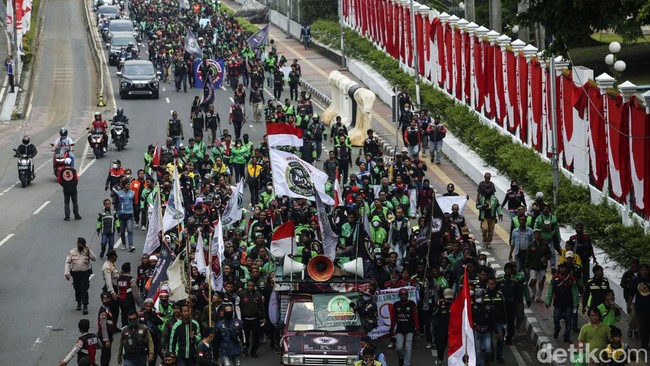 Jakarta - Koalisi Ojol Nasional 298 menggelar demo di gedung DPR, Jakarta. Setidaknya ada empat tuntutan dalam aksi ini, salah satunya menolak rencana kenaikan harga BBM.