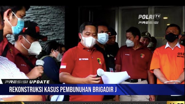 Sambo tampak dikawal oleh sejumlah orang. Ada tulisan 'Tahanan Bareskrim Polri' di belakang baju tahanan yang dikenakan Sambo. (Foto: Polri TV Radio)