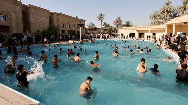Irak - Pendukung ulama Moqtada al-Sadr menyerbu Istana Pemerintah. Dalam aksi pendudukannya, mereka tampak asyik berpesta di kolam renang istana.